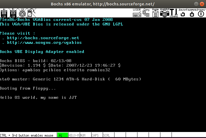bootsect.s 能在屏幕上打印一段提示信息“XXX is booting…”,其中 XXX 是你给自己的操作系统起的名字,例如 LZJos、Sunix 等(可以上论坛上秀秀谁的 OS 名字最帅,也可以显示一个特色 logo,以表示自己操作系统的与众不同。)